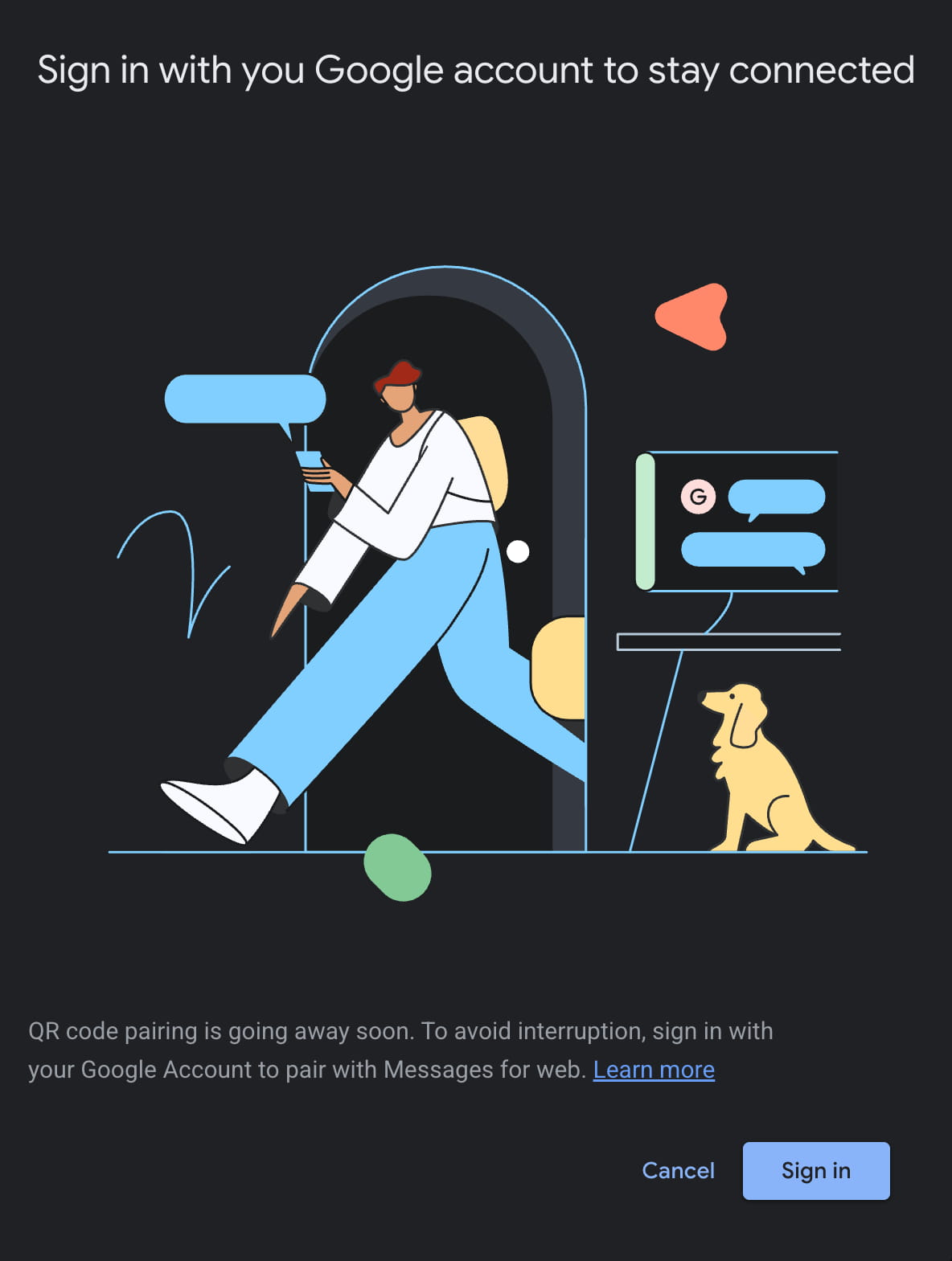 Opening messages.google.com/web and using the QR pairing option today reveals a new prompt to “Sign in with your Google account to stay connected.” Specifically, “QR code pairing is going away soon.”