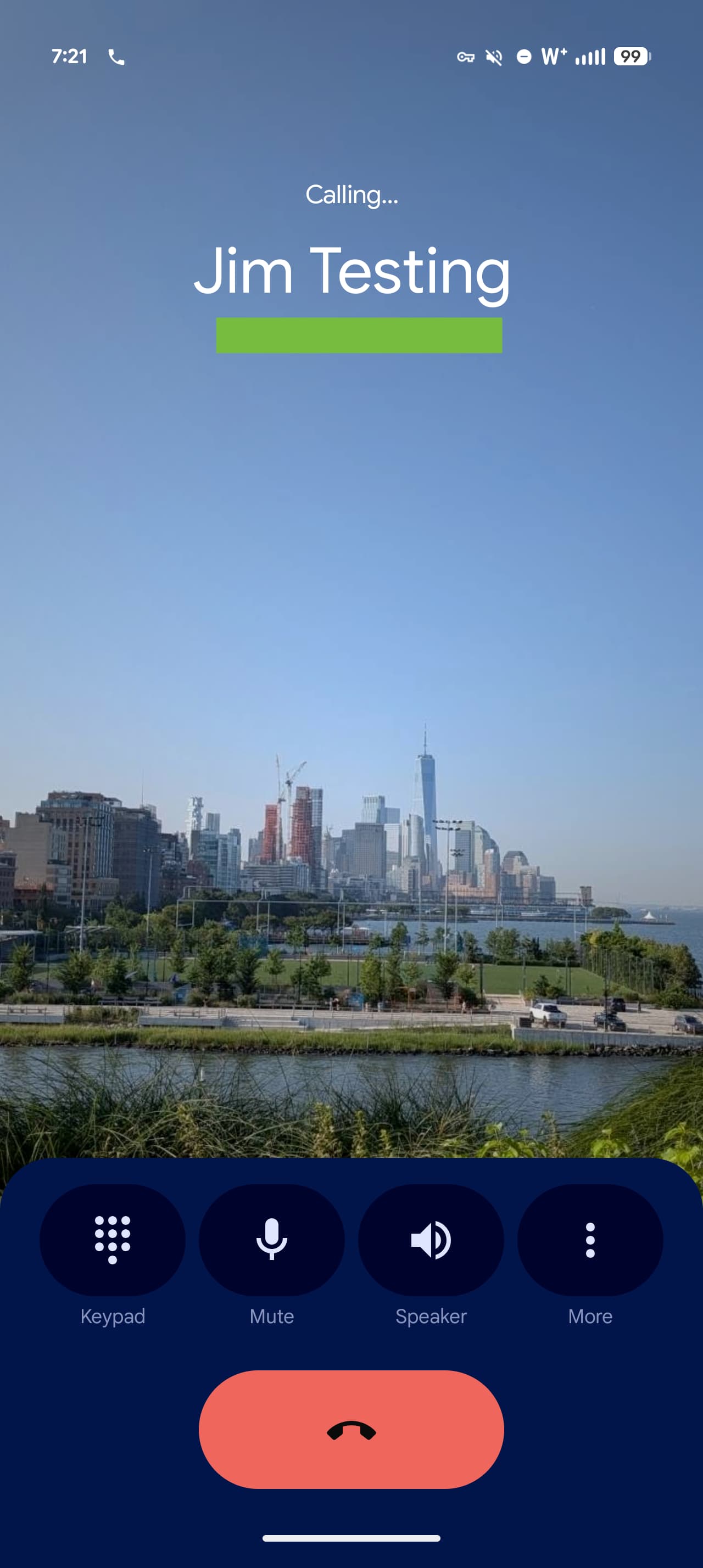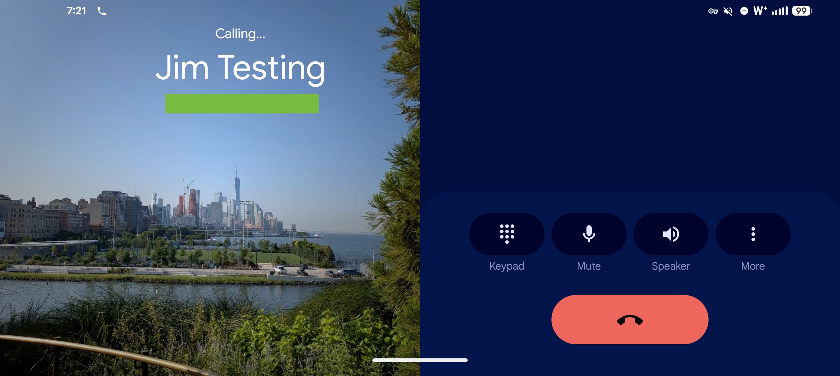 The Google Phone app offers a landscape two-column interface when on calls. On the left, you get their Calling Card, contact name, and number, with controls on the other side.
