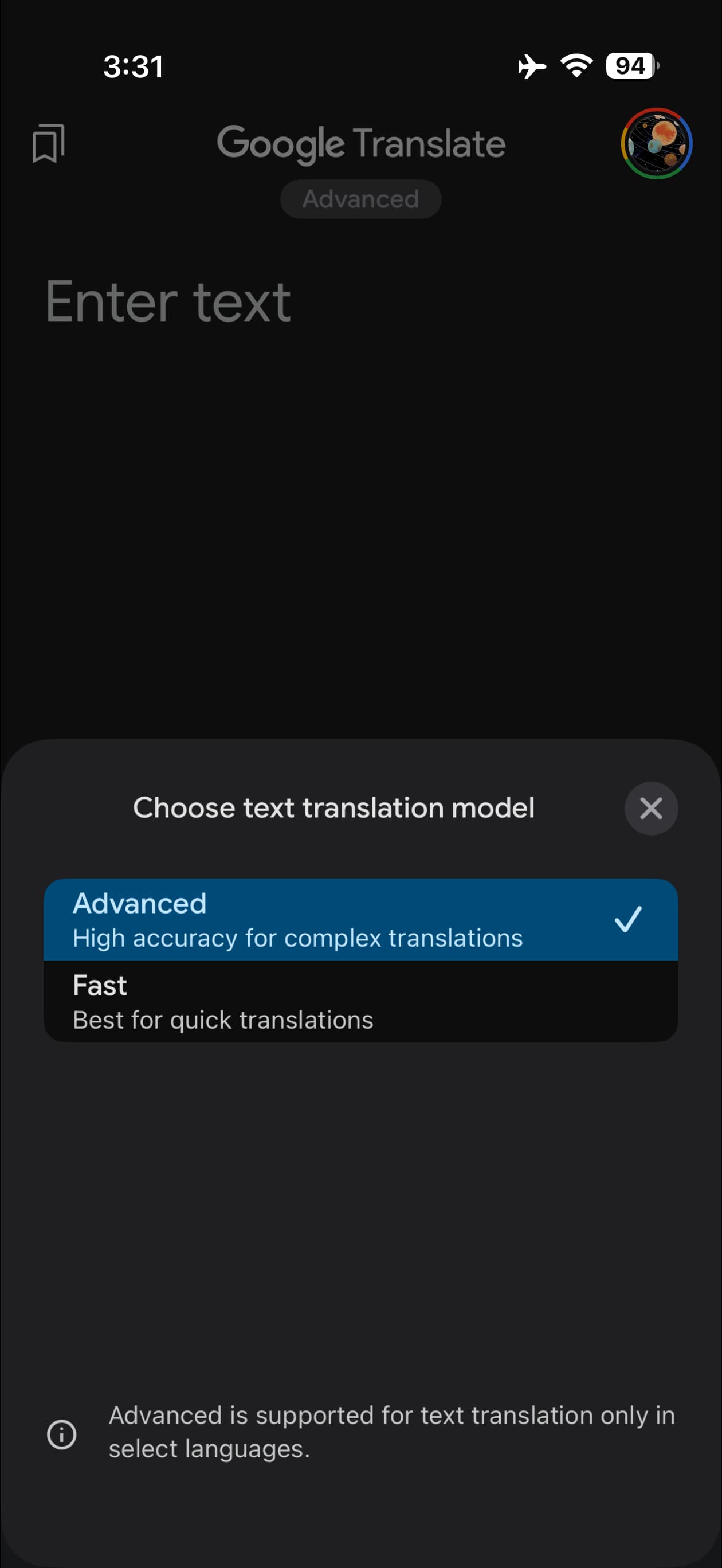 Google Translate adding Advanced’ or ‘Fast’ model picker