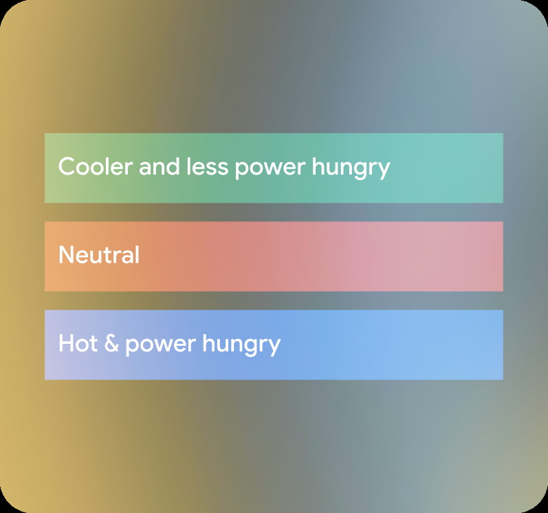 Green is the least power hungry, blue is the most, when comparing colors of equal tone as seen on the right. Minimize the number of pixels you light up. The brighter the screen, the hotter the display gets. Don’t fill the screen with all white, as this can cause thermal mitigation.