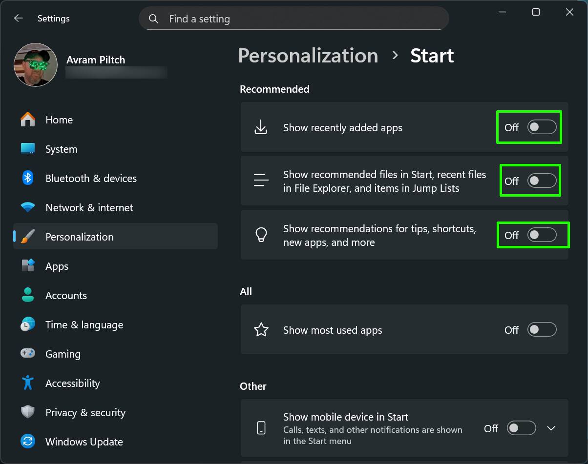 To do so, right click anywhere in the menu, select Settings, find the Personalization options menu, then toggle off the options to Show recently added apps, Show recommended files, and Show recommendations for tips.