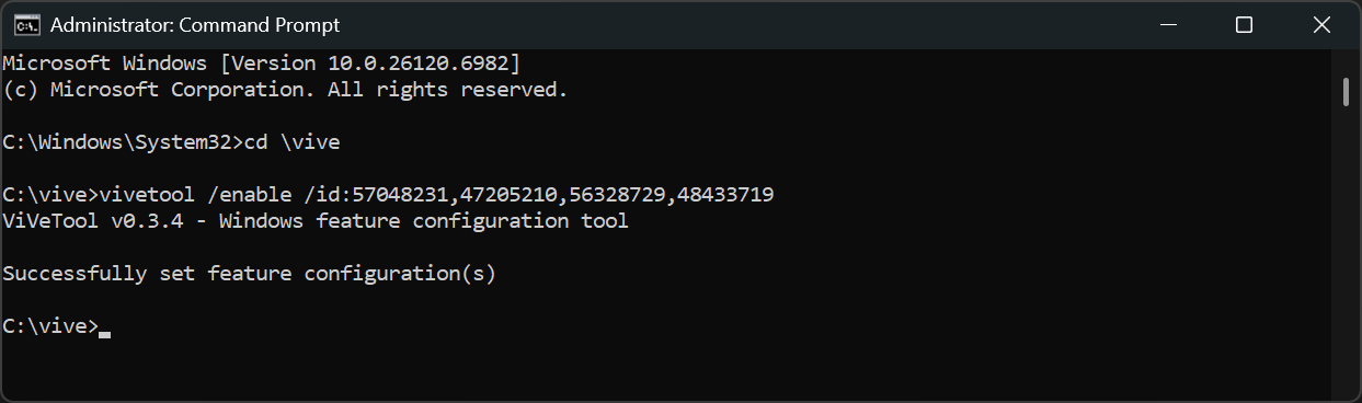 vivetool /enable /id:57048231,47205210,56328729,48433719