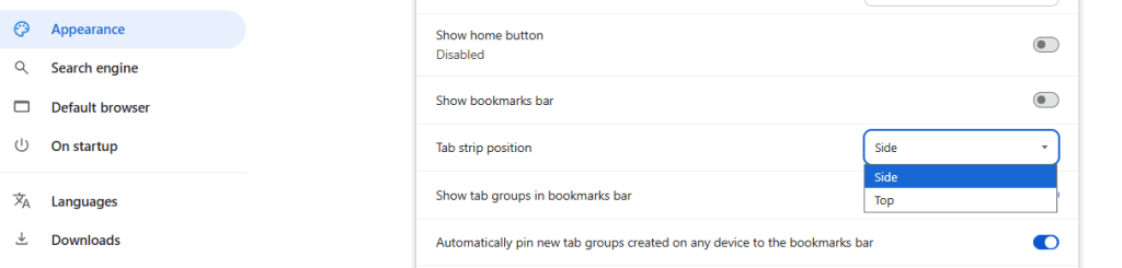 On relaunch, you’ll then need to go to Settings > Appearance in Chrome, and change the “Tab strip position” from “Top” to “Side.”