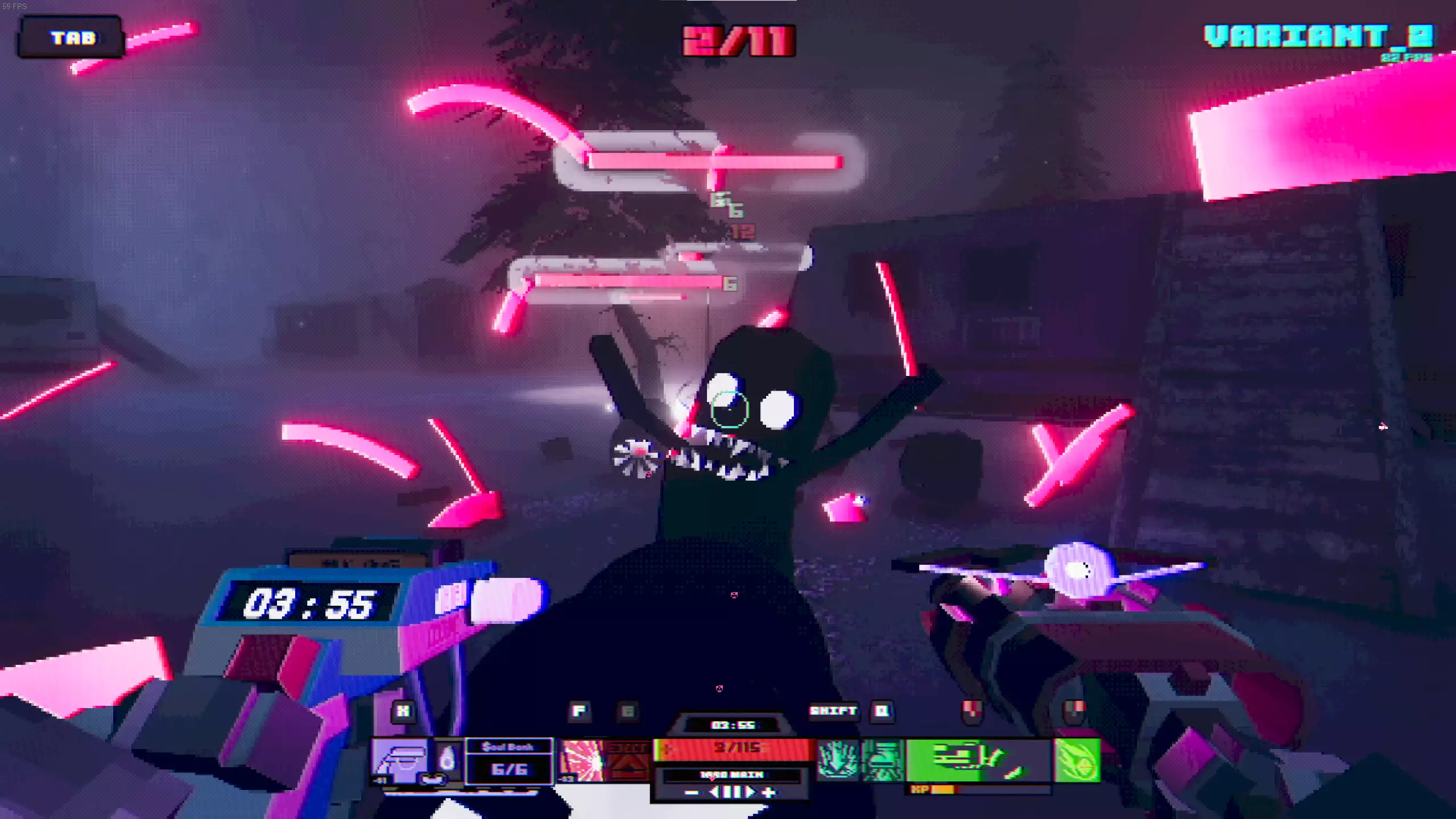 Oddcore begins with a wacky, bare-bones narrative about being trapped in some incomplete theme park resort with an “infinite room generator” that is on the fritz. After the quick tutorial, though, that narrative just serves as an excuse to throw you into a series of off-putting liminal spaces that make you feel like you’re trapped in a corrupted PlayStation 1 disc. Each of these low-res polygonal rooms slowly fills with malformed black-and-white demons, most of which run at you with a fanaticism straight out of Serious Sam, threatening to bite at your ankles or floating menacingly toward you while launching slow-moving pink projectiles at you.