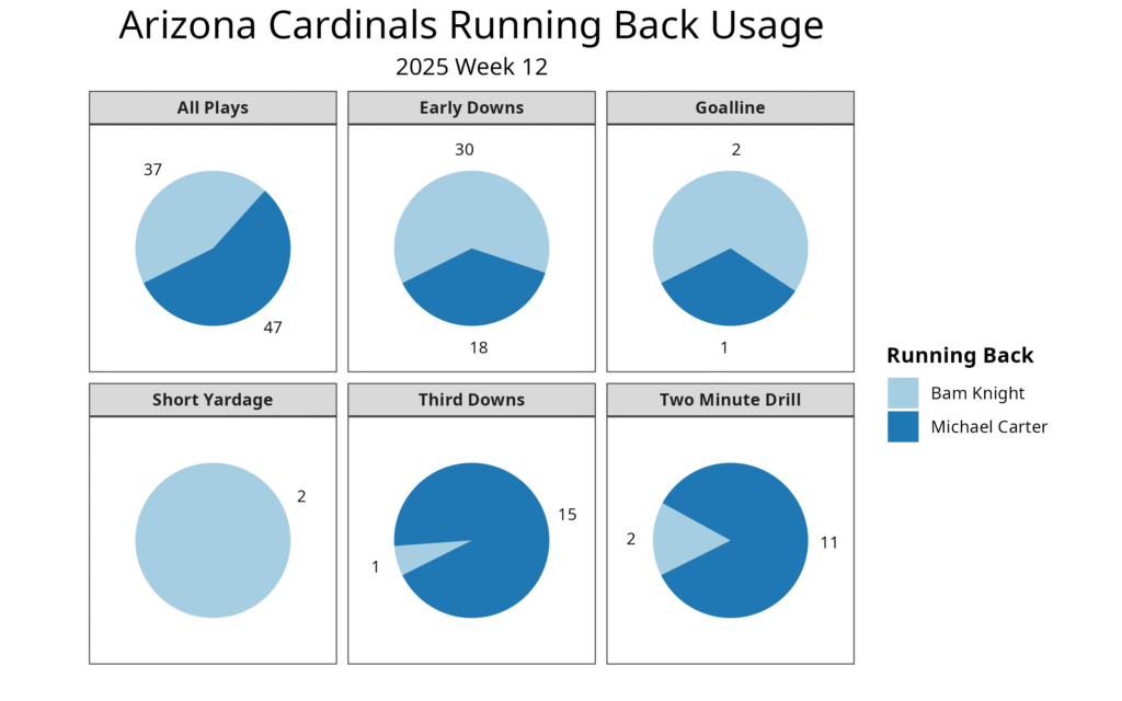 Arizona spent all game with a two-man running back rotation. Knight was the Cardinals’ lead back on early downs, and Carter was their third-down and two-minute drill back. Knight scored the touchdown, but he was not effective in the run game with 10 carries for 12 yards. Carter led the team in rushing with 28 yards on five carries.