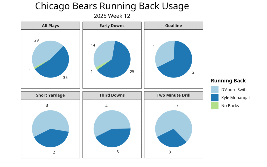In this game, Monangai played more on both early downs and at the goal line, while Swift remained the primary receiving back. While Swift lost a fumble early in the second quarter, the change in playing time seemed by design and not related to the fumble. Monangai played eight of a possible 13 snaps in the first quarter before Swift’s fumble. Swift was ineffective as a rusher this week, finishing with eight carries for 15 yards. This is the most that Ben Johnson’s backfield resembled one of his Detroit Lions backfield, as Monangai took the David Montgomery or Jamaal Williams role, while Swift had his old role in Johnson’s offense.