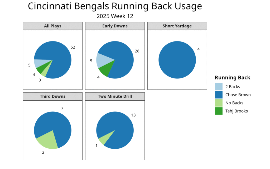 After Brooks suffered the concussion, Brown was the only running back to see the field. There were only three plays over the rest of the game where Brown wasn’t on the field, and they were clear passing situations where tight end Drew Sample lined up in the backfield.