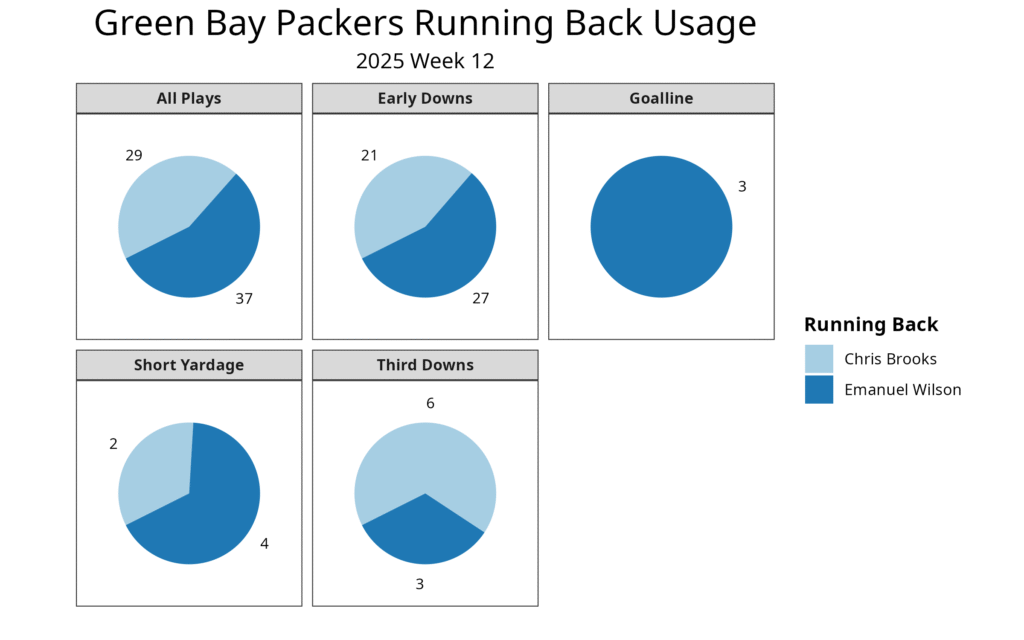 The Packers rotated their running backs significantly, but Wilson touched the ball on a very high percentage of his snaps, while Brooks was in for more passing situations, as well as garbage time. Green Bay usually prevents its lead running back from totaling too many touches to preserve them throughout the season, but the Packers seem confident Jacobs will be back next week, so they had no problem feeding Wilson.