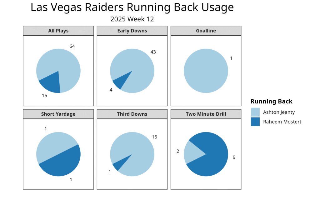 Jeanty has been the Raiders’ lead running back all season, playing 74% of the offensive snaps on the season. That has included at least 77% of the snaps on early downs, short-yardage situations and goal-line snaps. He’s split time with Raheem Mostert in passing situations. Mostert has also been the primary backup on early downs. Since Week 4, Mostert has played 106 snaps, while Dylan Laube played six snaps as the only other running back.