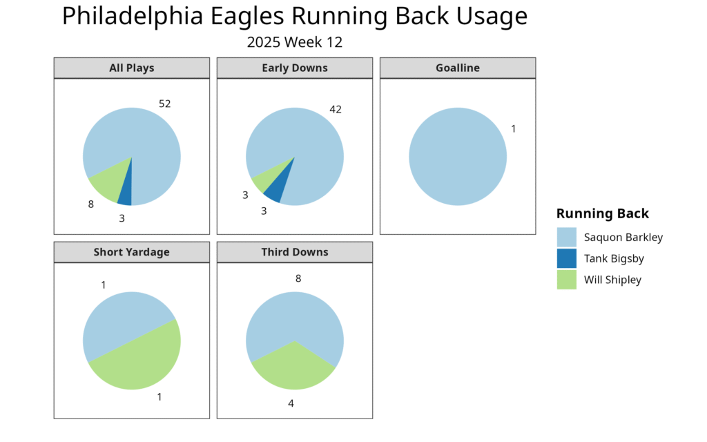 While the Eagles changed offensive coordinators from 2024 to 2025, it had only a minor impact on his receiving production. He averaged 17.4 receiving yards per game in 2024, and that was up to 20.7 this year, prior to this week. That was still much lower than his career high 45.1 receiving yards per game. He was also held to four receptions or fewer in every other game with Philadelphia.