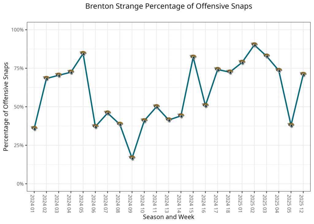 Strange played 71% of Jacksonville’s offensive snaps, which was a tad lower than the first four weeks of the season, but that is understandable given how much time he missed. He played 71% of the offensive snaps, taking 60% of the 11-personnel snaps on early downs, 77.8% on third downs and 77.4% in two-tight-end sets. Ideally, he will be back to playing 80% of the offensive snaps by next week.