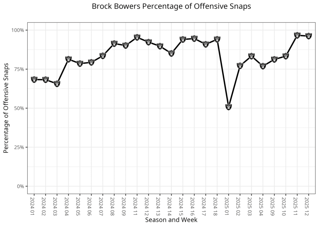 The Raiders spent most of the season with Brock Bowers and Mayer rotating snaps on early downs, Bowers taking third downs, and the two sharing the field for a high rate of 12 personnel. Last week, the Raiders shifted the strategy, turning Bowers more into a wide receiver and making 12 personnel more of their base offense. This left both Bowers and Mayer playing more than usual. They also used 13 personnel at a season-high rate.