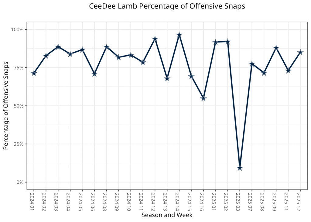 Lamb played 85% of the offensive snaps, which was only the second time he surpassed 80% since Week 2, while Turpin’s 47.3% was his most since Week 4. This change shouldn’t have a major impact on the Cowboys receivers’ fantasy value for the rest of the season, but Mingo could have value if some of the Cowboys’ wide receivers start suffering injuries.