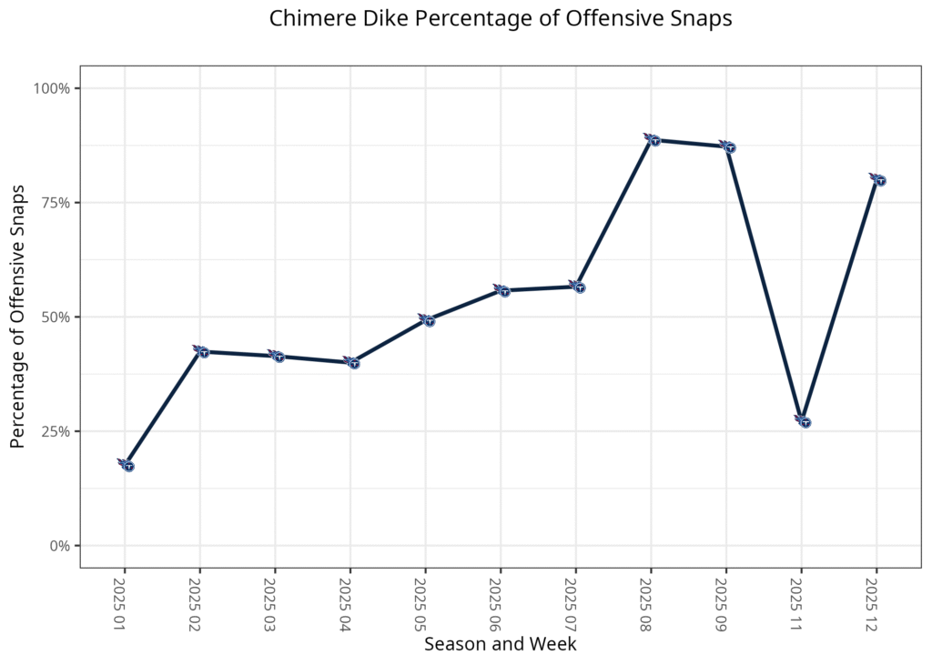 - Rookie Gunnar Helm played 56.2% of the third-down snaps out of 11 personnel for the Titans. It was the second game this season he played over 50%. However, Okonkwo’s injury could have played into this. As long as both tight ends are splitting snaps, it’s difficult to trust either for fantasy purposes.