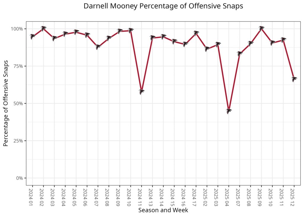 Atlanta has made other significant changes to personnel usage this season, including two weeks of several two-receiver sets, some weeks with a lot of 11 personnel, and others with a lot of 12. This will make it hard to trust Mooney, despite his good game.
