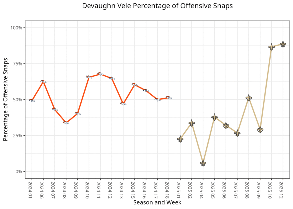 The Saints used a straightforward wide receiver rotation, as Olave and Vele played in two- and three-receiver sets, while Tipton was the third receiver in three-receiver sets. Vele was also the primary wide receiver in single-receiver sets, giving Vele the snap lead in this game. Olave remained the Saints’ top receiver with nine receptions for 70 yards, but Vele and Tipton both caught three passes each. Vele in particular is worth considering in deeper leagues.
