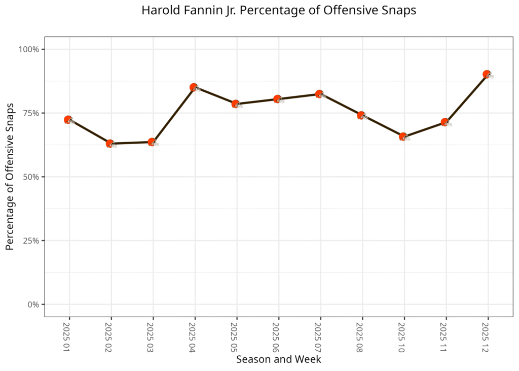 Harold Fannin Jr. leads the Browns tight ends: Fannin played a career-high 90.2% of the offensive snaps while David Njoku was under 50%.