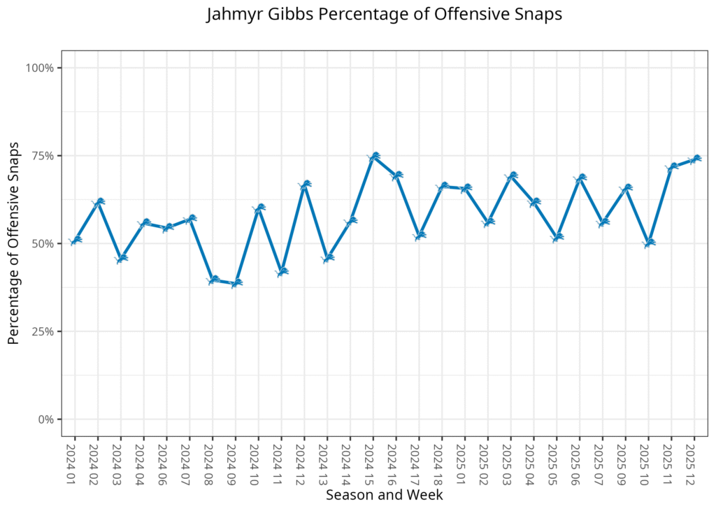 Jahmyr Gibbs plays a season-high 73.9% of the Lions’ offensive snaps: Gibbs’ previous season high was 72.9%, which occurred last week.