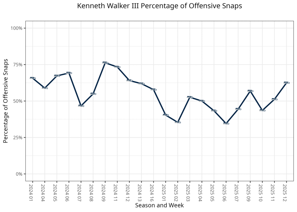From Weeks 6-10, Warren had played 56.7% of the snaps to Gainwell’s 39.6%. Warren played at least two-thirds of the snaps on early downs and in short-yardage and goal-line situations, while Gainwell played at least two-thirds of the third-down and two-minute drill snaps. This week, everything shifted a little more in Gainwell’s favor. Warren’s injury has likely contributed to this, although Gainwell’s big plays may have also played a factor.