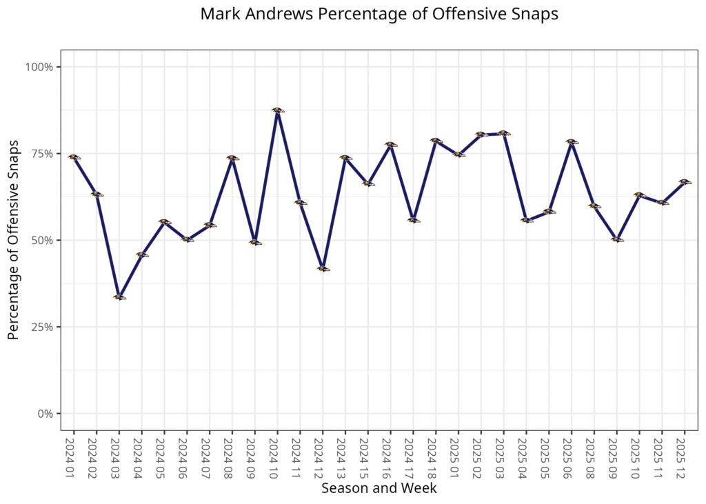 This leaves Andrews playing 50-63% of the snaps most weeks, and the one exception was in Week 6 when the Ravens ran 45 plays out of two-tight-end sets and 19 out of three-tight -end sets. The Ravens haven’t come close to hitting either mark in any other game this season.