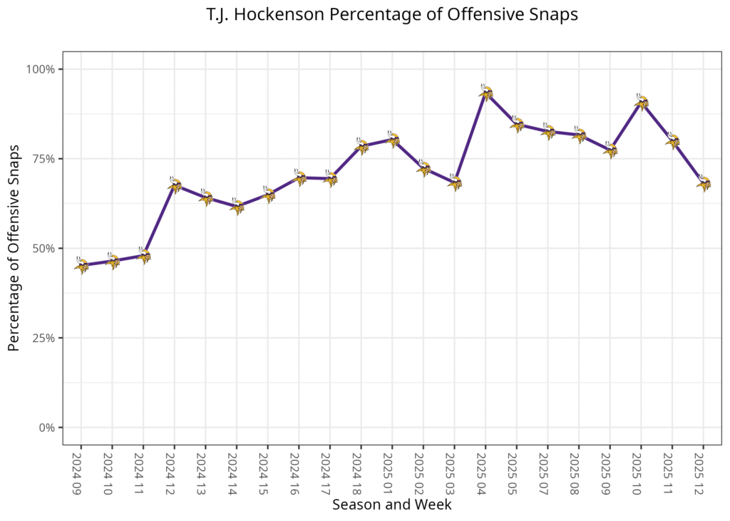This week, the two tight ends nearly split of the early-down snaps in single-tight-end sets, as Hockenson took 14, while Oliver played 12. The main reason Hockenson ended up with more offensive snaps on the day was the third-down snaps. Hockenson has been a disappointment from a fantasy perspective this season, as he didn’t have any games with more than 50 receiving yards. In 2023, he gained 50-plus yards in 13 of 15 games. He caught four passes for 19 yards in this game.
