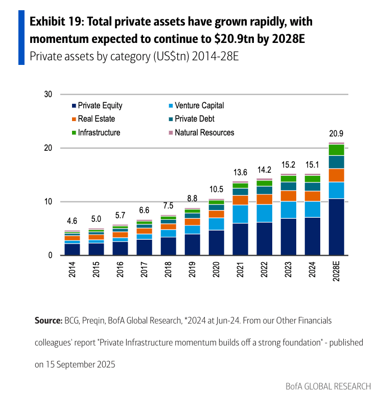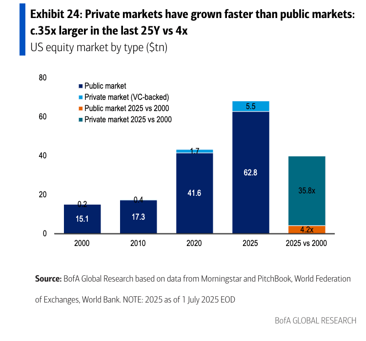 Private capital, defined by the bank as assets not available on public markets, includes private equity, private credit and real assets. It has multiplied at a staggering pace, more than doubling since 2012 to $22 trillion by 2024. This explosion has been driven by a retreat from public markets. Since 2000, the number of U.S.-listed companies has halved to just over 4,000, even as the number of private venture-backed firms soared 25-fold. Startups now remain private for an average of 16 years, a third longer than a decade ago, reflecting a broad shift toward private capital and away from public scrutiny and regulation.