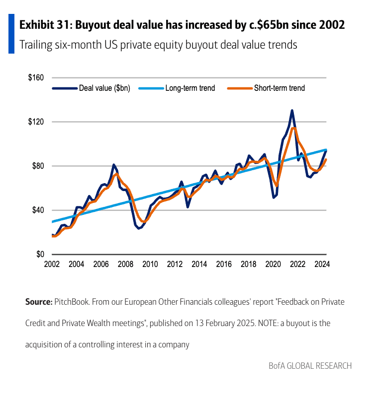 For investors, BofA finds that private equity has notably outperformed the S&P 500 over this period, by six percentage points per year on average. And there are other benefits to privacy, BofA analysts add: “In the time spent on financial regulation paperwork every year, 12 Great Pyramids of Giza could be built.”