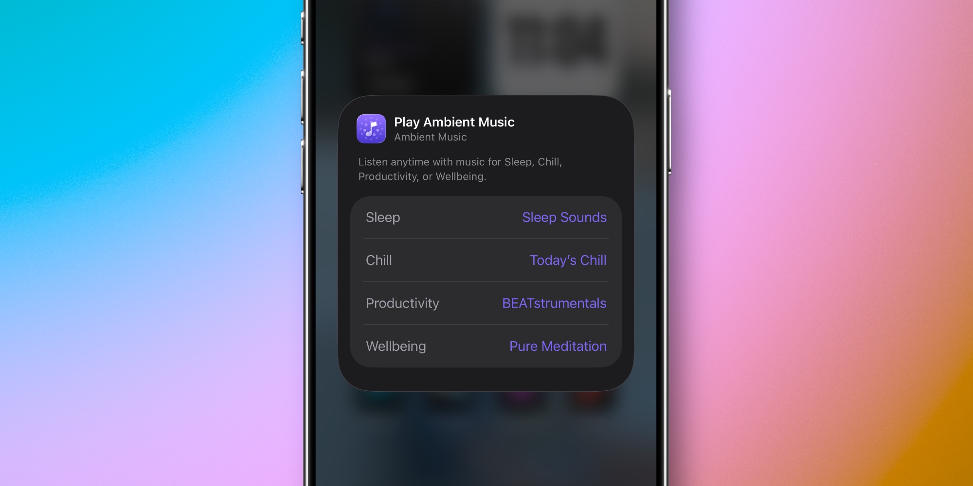 New ‘Ambient Music’ widgets let you kick off playback of up to four playlists fitting specific moods with a single tap.