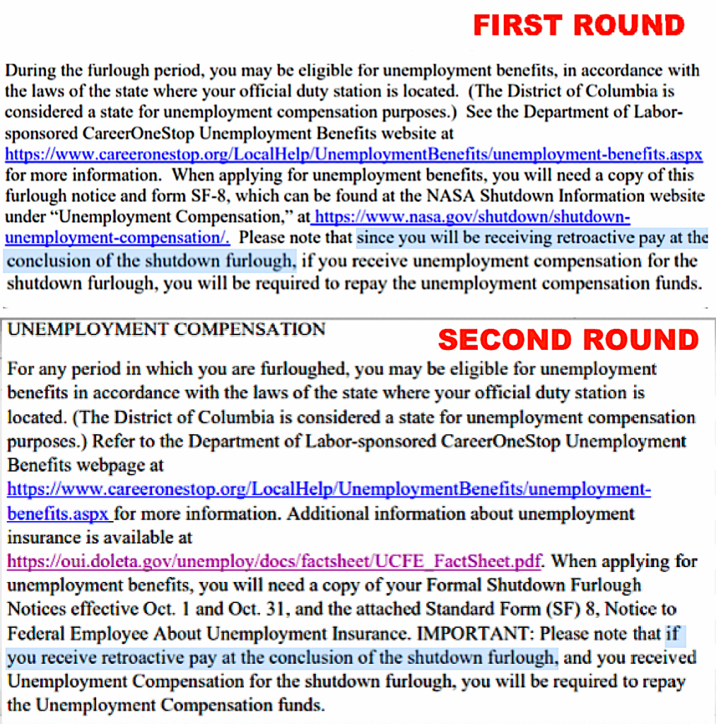 Round 1: “Please note that since you will be receiving retroactive pay at the conclusion of the shutdown furlough, if you receive unemployment compensation for the shutdown furlough, you will be required to repay the unemployment compensation funds.”