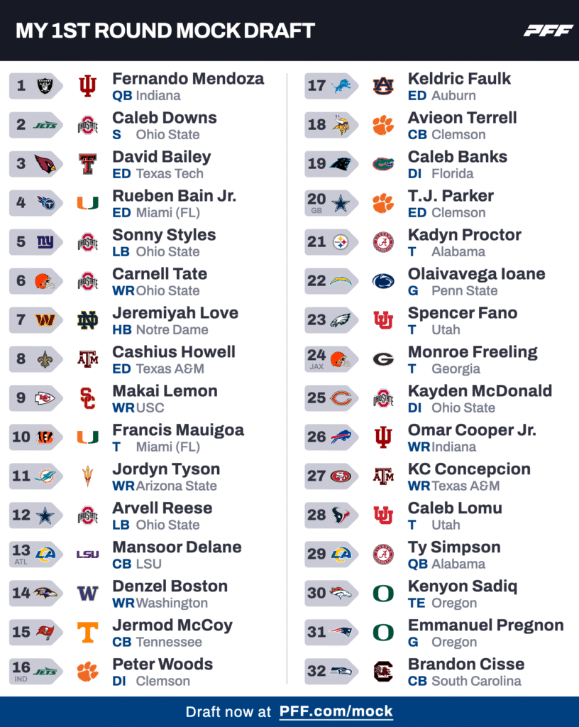 The Saints could go in several directions here, but Howell makes sense because of the class’ drop-off at edge defender after him. He earned a 90.3 PFF overall grade and produced a 19.9% PFF pass-rush win rate in 2025, and he could form a formidable duo with Chase Young in New Orleans.