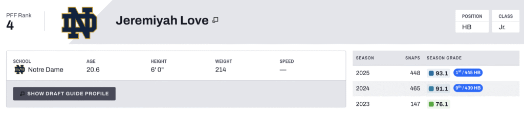 His on-field production wasn’t incredible in 2025, leading to a 69.0 PFF overall grade, but there is a lot of athleticism to work with, which will make Sadiq a top target for many NFL teams.