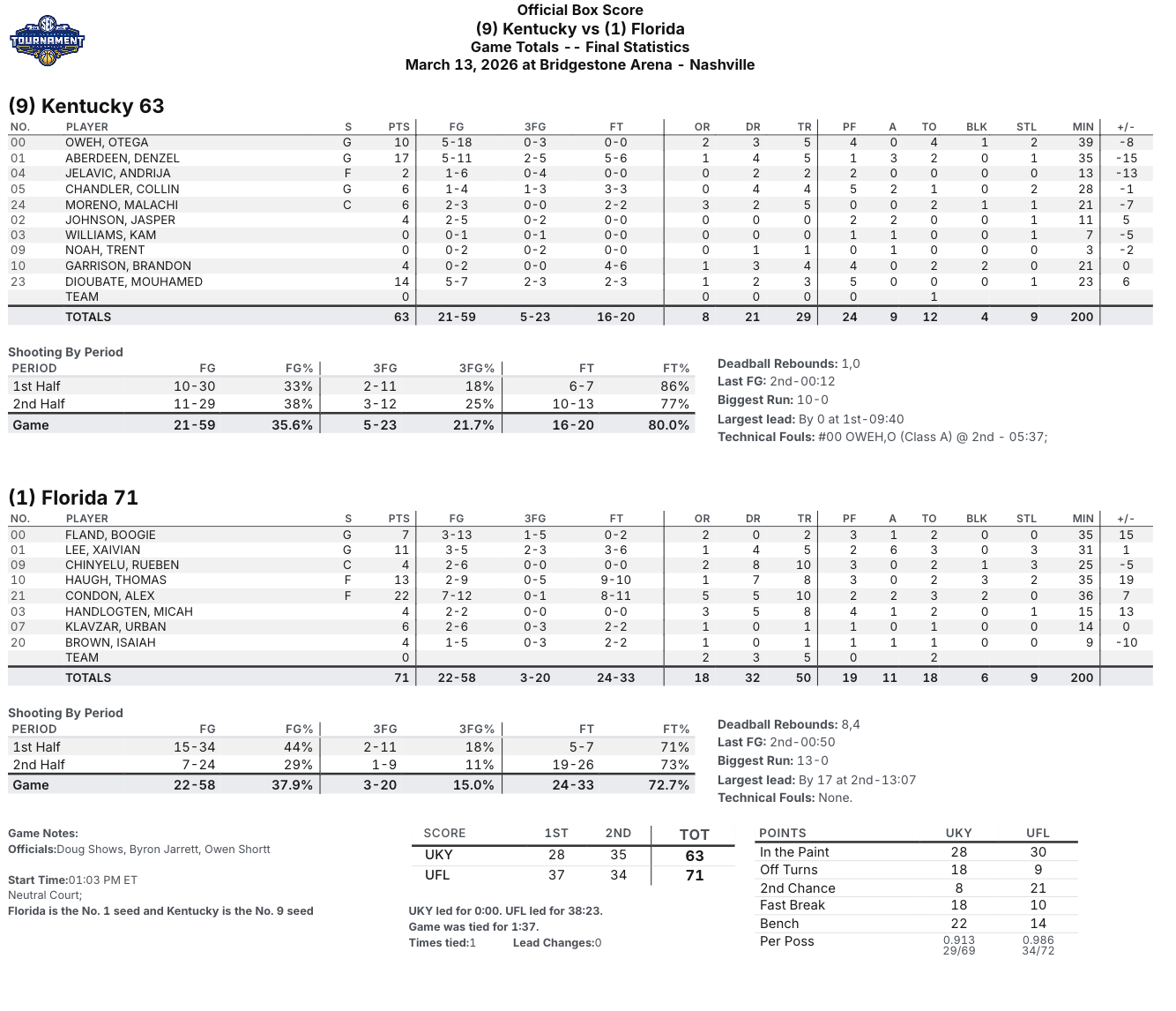 On Friday afternoon in Nashville, 9-seeded Kentucky was knocked out of the SEC Tournament with a 71-63 quarterfinal loss to the top-seeded Gators. It was anything but a pretty game of basketball from either side, but rebounding proved to be the major difference. Florida outrebounded the Wildcats by 21 overall (50-29) and by 10 on the offensive glass (18-8), which led to 21 second-chance points for the Gators. Kentucky couldn’t throw the ball in the ocean, shooting 35.6 percent from the field with a 5-23 clip from long range.