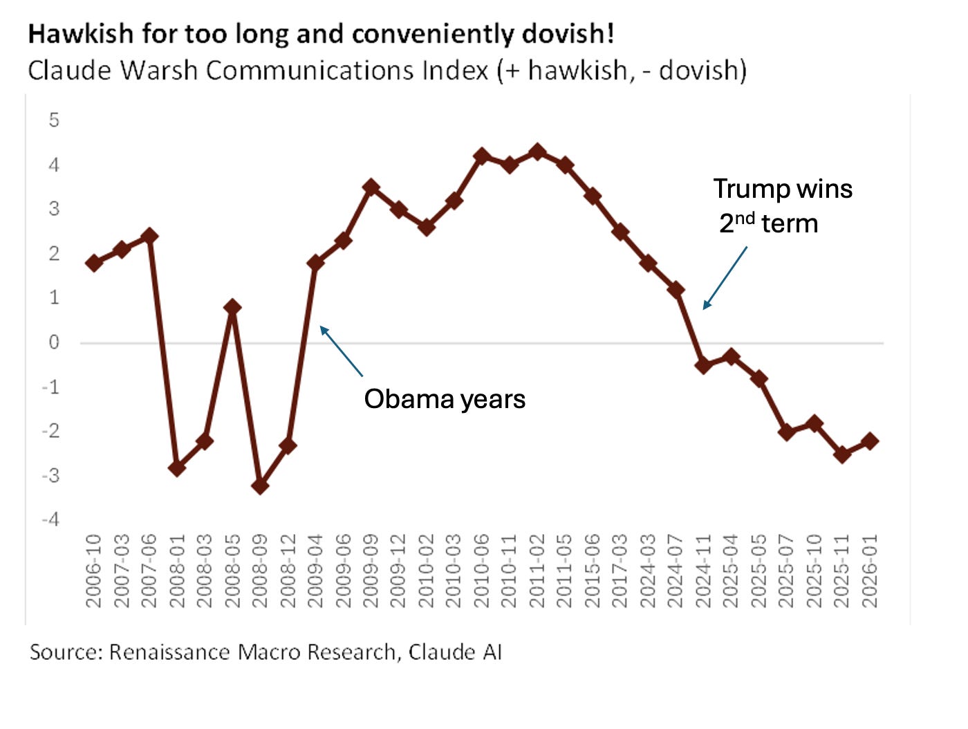 And I have a picture! Neil Dutta of Renaissance Macro, another skeptic, asked Claude to rate Warsh’s speeches and public comments over the years for monetary hawkishness or dovishness. He sent me the chart at the top of this post. Warsh was very hawkish in the years following the 2008 financial crisis. But he turned abruptly dovish … after Donald Trump won in 2024.