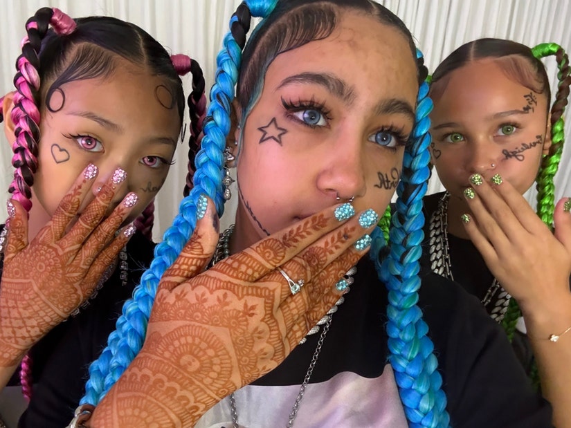 In a series of photos and videos shared on their joint TikTok account, North wore a bold look while hanging out with friends. The eldest daughter of Kim, 45, and her ex-husband Kanye West rocked waist-length blue braids, temporary face tattoos, a nose ring, colored contacts, and grillz, with North matching her peers who wore similar ensembles in different colors