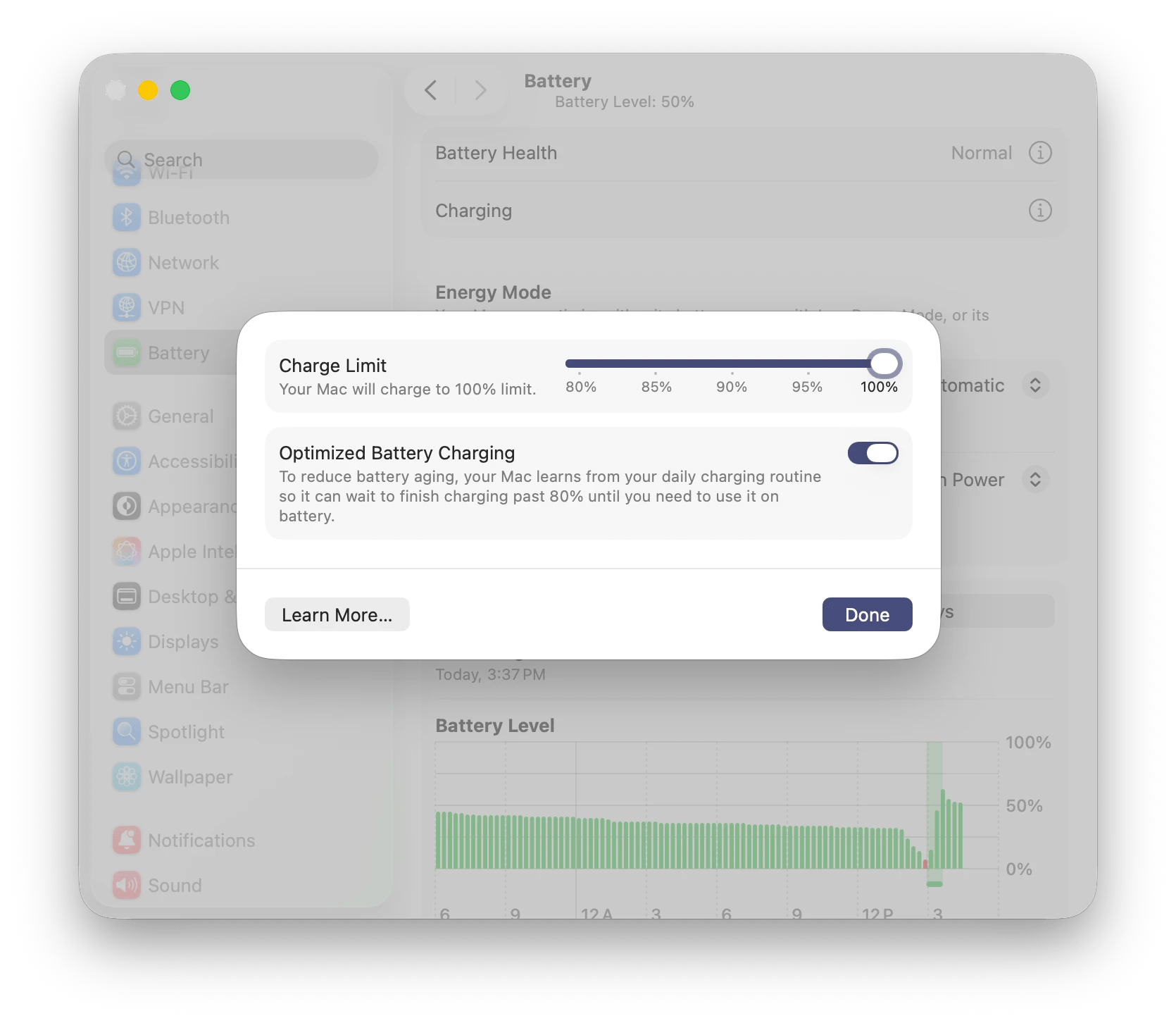 Charge Limit is a feature that lets you specify a maximum charge level for your device. At first, this was limited to 80%, but with iOS 18 it was expanded to include options between 80% and 100%. Now, with the first beta of macOS 26.4, Mac users can now specify a charge limit between 80% and 100%: