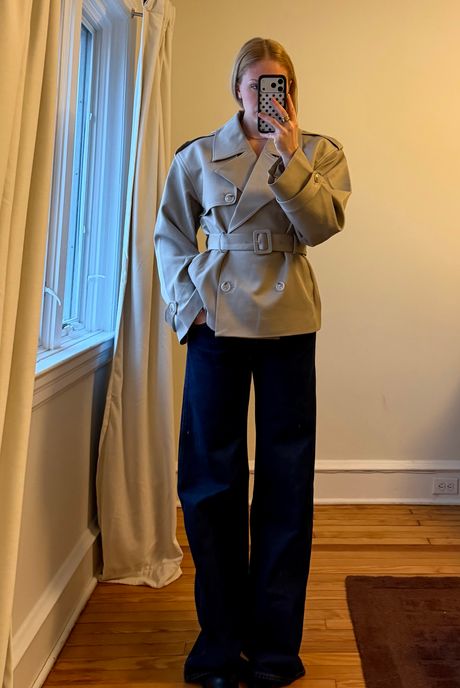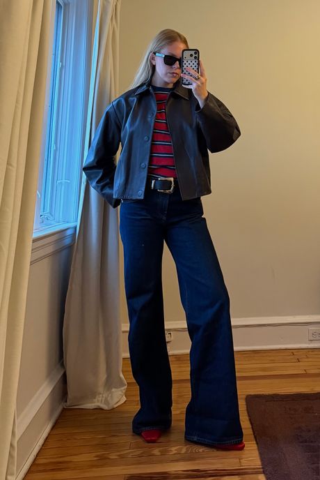 When I unboxed the Coolidges, I immediately wished I had a beige fur coat like this one to pair them with. But since I don’t own one, I settled for my new Reformation funnel-neck jacket and a pair of Margaux ballet flats for a day at the office. I also wore them to an event with a short trench coat and my new favorite boots from Black Suede Studio. I loved the silhouette of a cinched coat paired with super-wide-leg pants, and I’ll definitely be wearing this outfit again in the spring. During New York Fashion Week, I styled these jeans with a Damson Madder striped tee, a St. Agni brown leather jacket (both are sold out, but you can shop similar options below), and red mules.
