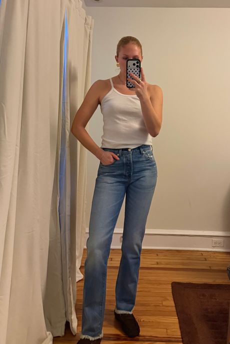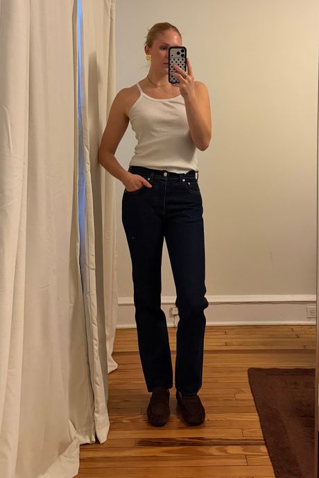 The 27s are too small. I could barely get them buttoned, and when I finally did, it felt like they were bursting at the seams. I also nearly crashed out when I looked in the mirror and saw the way the thick, rigid denim made my legs look. I’m sure these jeans would be more flattering if they fit me better, but I can’t say with confidence that sizing up to a 28 would solve the problem.