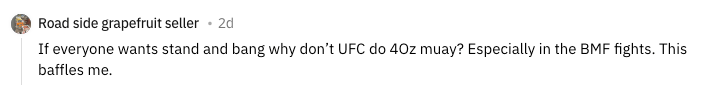 If everyone wants stand and bang why don’t UFC do 4 oz Muay Thai? Especially in the BMF fights. This baffles me.