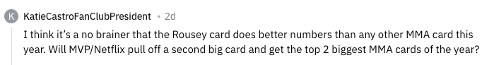 I think it’s a no brainer that the Ronda Rousey card does better numbers than any other MMA card this year. Will MVP/Netflix pull off a second big card and get the top 2 biggest MMA cards of the year?