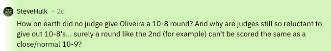 How on Earth did no judge give Oliveira a 10-8 round? And why are judges still so reluctant to give out 10-8’s… surely a round like the 2nd (for example) can’t be scored the same as a close/normal 10-9?