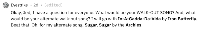 Okay, Jed, I have a question for everyone. What would be your WALK-OUT SONG? And, what would be your alternate walk-out song? I will go with In-A-Gadda-Da-Vida by Iron Butterfly. Beat that. Oh, for my alternate song, Sugar, Sugar by the Archies.