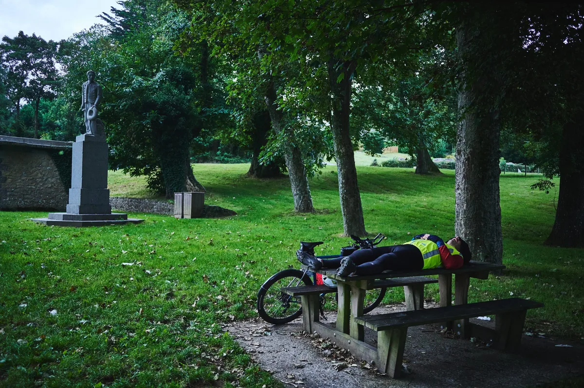 Clocking up big mileage means cyclists can often fall sleep any time, any place. Joseph Branston