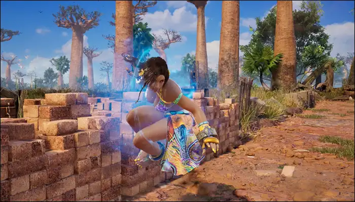 In her trailer, we are first introduced to her somewhat animalistic fighting style coupled with her ability to summon a pole of energy to interact with. The blog post specifies these abilities by saying “Miary Zo was created with the keyword “Fighting God Reborn,” and characterized as curious and cheerful. Her fighting style doesn’t fit into a single mold; instead, she battles with boundless energy. In addition to incorporating Morengy—a traditional martial art of Madagascar—along with authentic strikes unique to African fighting techniques, she also uses charming attacks that mimic the movements of ring-tailed lemurs.”