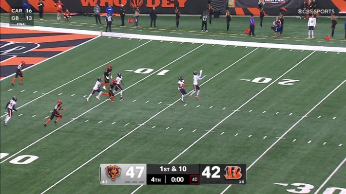 But the Bears kicked out of Flacco Magic. Williams found Loveland upfield for a 58-yard touchdown with 17 seconds left that was aided by nobody on the Bengals’ defense being able to tackle, and gave the Bears the improbable win after almost allowing an embarrassing comeback.