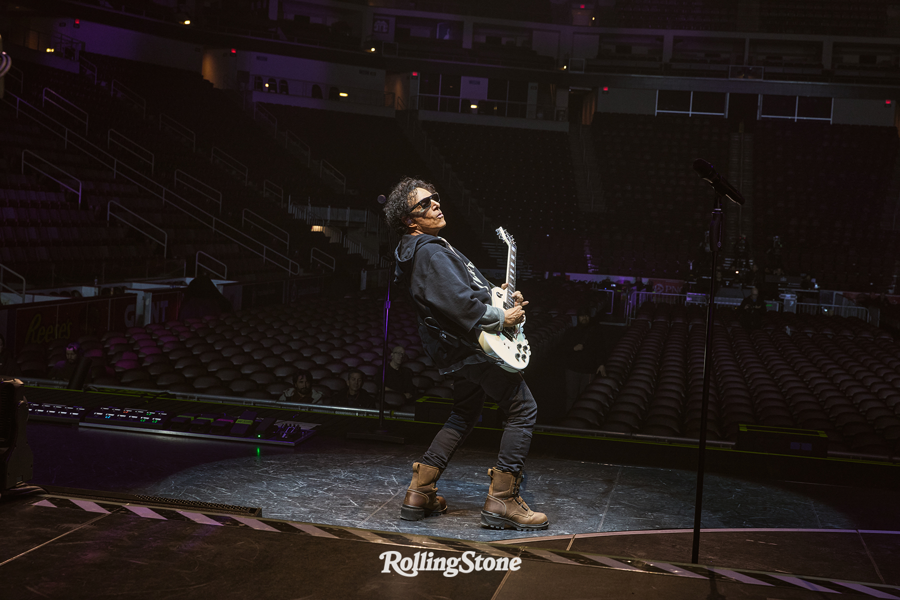 BEFORE LONG, IT’S time to head into the arena and finally see the members of Journey come together and make some music. I walk through the empty arena and find an aisle seat on the floor, about 15 rows back, letting various family members and crew sit in front: The Schon clan is on the right, Pineda’s family in the middle, and Cain’s people to the left.
