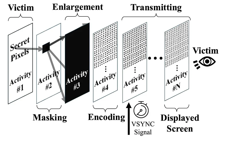 In other words, the idea is to invoke a target app containing information of interest (e.g., 2FA codes) and cause the data to be submitted for rendering, following which the rogue app installed the device isolates the coordinates of a target pixel (i.e., ones which contain the 2FA code) and induces a stack of semi-transparent activities to mask, enlarge, and transmit that pixel using the side-channel. This step is then repeated for every pixel pushed to the rendering pipeline.