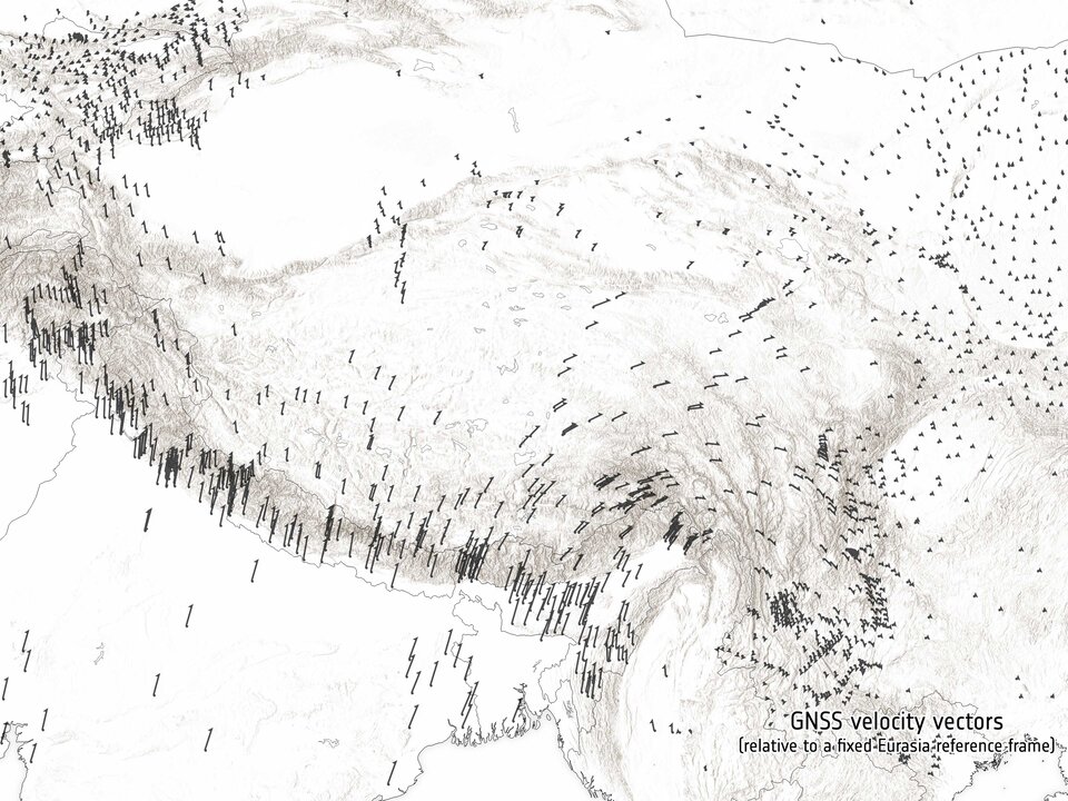 The horizontal deformation is clearly shown in the map below, where the ‘strain rate’ along the Altyn Tagh, the Kunlun and the Xianshuihe fault lines is visible in dark red. These are points where Earth’s crust is being stretched, shortened or sheared and the strain rate tells us how quickly this is happening over a specific time period.