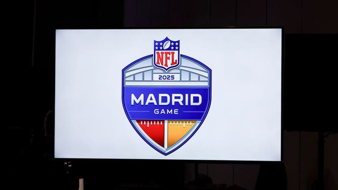 The logo for the 2025 NFL game in Madrid, Spain during a press conference at the Mandalay Bay North Convention Center on February 9, 2024 in Las Vegas, Nevada. (Photo by Don Juan Moore/Getty Images)