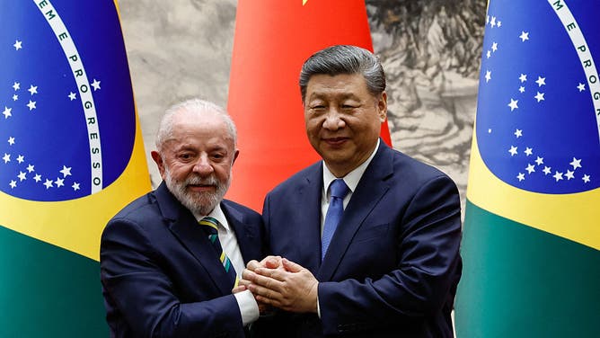 Chinese President Xi Jinping (R) shakes hands with Brazil’s President Luiz Inacio Lula da Silva after a signing ceremony and a joint press conference, at the Great Hall of the People in Beijing on May 13, 2025. (Photo by TINGSHU WANG / POOL / AFP) (Photo by TINGSHU WANG/POOL/AFP via Getty Images)