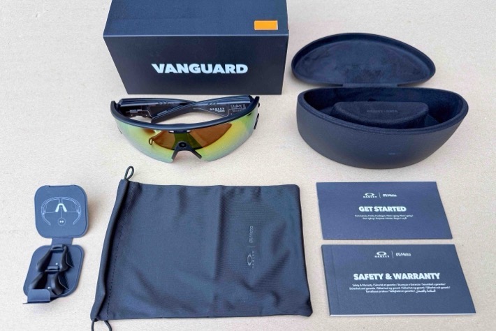 Inside the box things are pretty straightforward. You’ve got packaging that wraps around the sunglass case, and inside the case are the Oakley Vanguards. Below it is a polishing cloth, as well as two extra nose bridges.